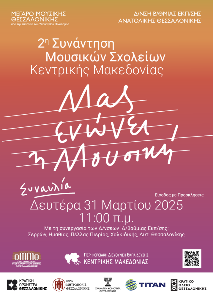 Η 2η συνάντηση Μουσικών Σχολείων Κεντρικής Μακεδονίας θα πραγματοποιηθεί τη Δευτέρα 31 Μαρτίου 11:00 π.μ. στο Μέγαρο Μουσικής Θεσσαλονίκης σε συνεργασία με το Μέγαρο Μουσικής Θεσσαλονίκης, την Περιφερειακή Διεύθυνση Εκπαίδευσης Κεντρικής Μακεδονίας, τις Διευθύνσεις Δευτεροβάθμιας Εκπαίδευσης, Σερρών, Ημαθίας, Πέλλας, Πιερίας, Δυτικής Θεσσαλονίκης και Χαλκιδικής, το Μουσικό Σχολείο Θεσσαλονίκης και με την υποστήριξη της Κρατικής Ορχήστρας Θεσσαλονίκης. Έχει ως στόχο της την προαγωγή της συνεργασίας των συμμετεχόντων/ουσών εκπαιδευτικών και μαθητών/τριών σε κοινούς εκπαιδευτικούς και καλλιτεχνικούς στόχους.