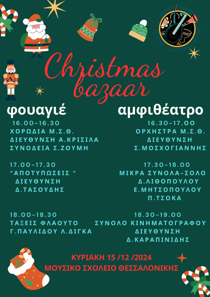 Tην Κυριακή 15 Δεκεμβρίου 2024 και ώρα 12:00 – 19:00 διοργανώνεται από τον Σύλλογο Γονέων και Κηδεμόνων του Μουσικού Σχολείου Θεσσαλονίκης με τη συνδρομή των μαθητών/τριών όλων των βαθμίδων και την υποστήριξη της Διεύθυνσης και των εκπαιδευτικών του σχολείου μας το Χριστουγεννιάτικο bazaar. Οι μαθητές και οι μαθήτριές μας θα παρουσιάσουν δράσεις και εορταστικά δρώμενα. Οι μουσικές εκδηλώσεις θα πραγματοποιηθούν 16.00 μμ – 19.00 μμ με δωρεάν είσοδο για το κοινό στους χώρους του σχολείου μας. Ελάτε να να περιηγηθείτε στους πάγκους, να αγοράσετε προϊόντα, να ακούσετε καλή μουσική. Σας περιμένουμε με χαρά και εορταστική διάθεση!