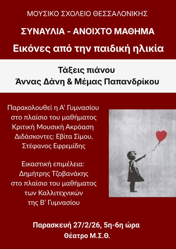 Μια ιδιαίτερη μουσική διαδρομή στον κόσμο της παιδικής ηλικίας και της νεότητας ετοιμάζουν οι μαθητές και οι καθηγητές του σχολείου μας, αναδεικνύοντας τη δύναμη της καλλιτεχνικής σύμπραξης. Την Παρασκευή 27 Φεβρουαρίου 2026, το θέατρο «Θεοπίστη Οσλιανίτου» του Μουσικού Σχολείου Θεσσαλονίκης θα γεμίσει με μελωδίες πιάνου σε μια εκδήλωση που συνδυάζει τη συναυλιακή εμπειρία με την εκπαιδευτική διαδικασία. Η συναυλία – ανοιχτό μάθημα έχει τίτλο «Εικόνες από την παιδική ηλικία» και θα πραγματοποιηθεί από τις 11:20 έως τις 12:45, κατά την 5η και 6η διδακτική ώρα. Στη συναυλία συμμετέχουν οι τάξεις πιάνου των εκπαιδευτικών Άννας Δάνη και Γερασιμούλας Παπανδρίκου, όπου οι μαθητές θα ερμηνεύσουν έργα από ένα ευρύ φάσμα πιανιστικών συλλογών, έχοντας ως κεντρικό άξονα την παιδική αθωότητα και τη δημιουργική φαντασία της νεότητας.