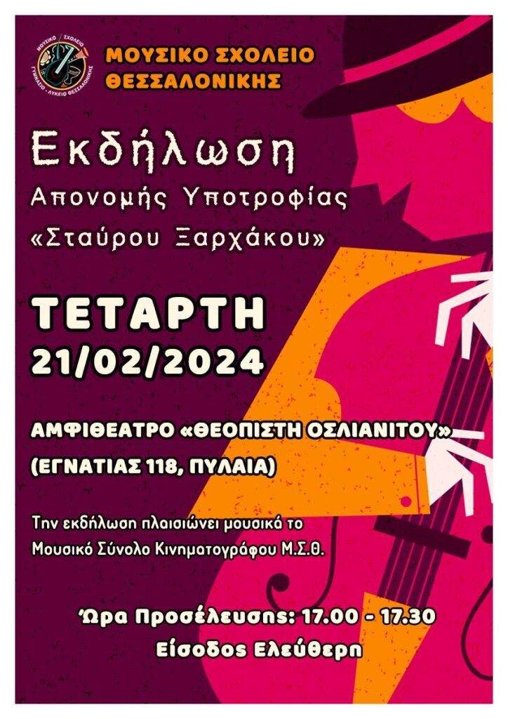 Την Τετάρτη 21 Φεβρουαρίου 2024 και ώρα 17:30 στο Αμφιθέατρο του Μουσικού Σχολείου Θεσσαλονίκης “Θεοπίστη Οσλιανίτου” θα πραγματοποιηθεί εκδήλωση απονομής της τρίτης υποτροφίας “Σταύρου Ξαρχάκου”.