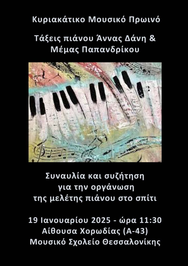 Την Κυριακή 19 Ιανουαρίου 2025 και ώρα 11:30, θα πραγματοποιηθεί στην αίθουσα Χορωδίας (Α-43) του Μουσικού Σχολείου Θεσσαλονίκης μια μικρή συναυλία μαθητών/τριών των τάξεων πιάνου της Άννας Δάνη και της Μέμας Παπανδρίκου σε συνδυασμό με συζήτηση για την οργάνωση της μελέτης πιάνου στο σπίτι και τη διαχείριση των δυσκολιών που αντιμετωπίζουν τα παιδιά.