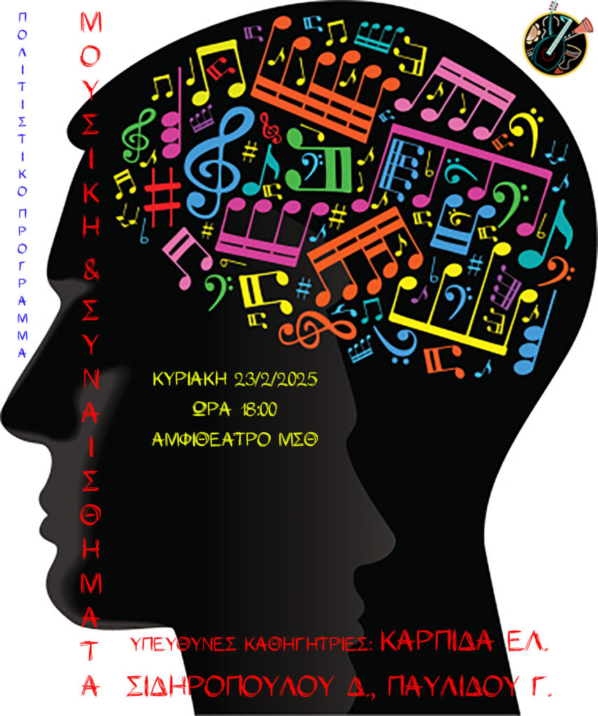 Την Κυριακή 23 Φεβρουαρίου 2025 και ώρα 18:00μμ στο Αμφιθέατρο του Μουσικού Σχολείου Θεσσαλονίκης «Θεοπίστη Οσλιανίτου» προγραμματίζεται εκδήλωση παρουσίασης του εγκεκριμένου (αρ. πρωτ. 35639/16-12-2024) πολιτιστικού προγράμματος «Μουσική και συναισθήματα» με υπεύθυνη εκπαιδευτικό την κα Ελένη Καρπίδα (ΠΕ79.01) και συμμετέχουσες τις εκπαιδευτικούς Δομνίκη Σιδηροπούλου (ΠΕ79.01) και Γεσθημανή Παυλίδου (ΠΕ79.01).