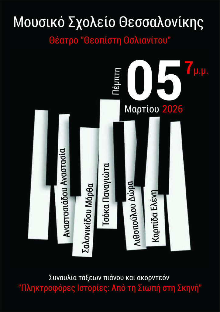 Η μουσική δεν αποτελείται μόνο από νότες, αλλά από ανάσες, ρυθμό και, πάνω από όλα, από έναν μοναδικό τρόπο να επικοινωνούμε όσα οι λέξεις συχνά αδυνατούν να περιγράψουν. Την Πέμπτη, 5 Μαρτίου 2026, στις 19:00, το Θέατρο του Μουσικού Σχολείου Θεσσαλονίκης φιλοξενεί μια πρωτότυπη μουσική εμπειρία που συνδυάζει την καλλιτεχνική δημιουργία με την ψυχική ευεξία. Η συναυλία «Πληκτροφόρες Ιστορίες – Από τη Σιωπή στη Σκηνή» φέρνει στο προσκήνιο δύο όργανα που αναπνέουν και αφηγούνται, το ακορντεόν και το πιάνο, δημιουργώντας έναν ζωντανό διάλογο γύρω από τη διαχείριση του άγχους και τη μεταμόρφωση της εσωτερικής έντασης σε δημιουργική έκφραση.