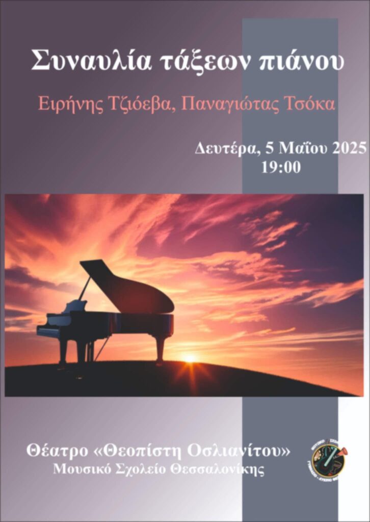 Τη Δευτέρα 5 Μαΐου 2025 και ώρα 19:00, στο Αμφιθέατρο Θεοπίστη Οσλιανίτου του Μουσικού Σχολείου Θεσσαλονίκης (Μ.Σ.Θ.), οι μαθητές/τριες των τάξεων πιάνου της Ειρήνης Τζιόεβα και της Παναγιώτας Τσόκα θα παρουσιάσουν έργα από την εποχή Baroque ως και τη σύγχρονη εποχή για σόλο πιάνο, για δύο και για τέσσερις πιανίστες, για πιάνο και έγχορδα.