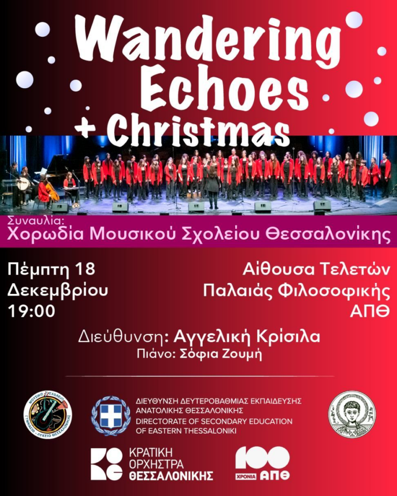 Περίπου ένα μήνα μετά τη συγκλονιστική συναυλία “Wandering Echoes” της Χορωδίας του Μουσικού Σχολείου Θεσσαλονίκης στη Φιλαρμονική της πόλης των Σκοπίων η μεγάλη επιτυχία επαναλήφθηκε στην αίθουσα τελετών της Παλαιάς Φιλοσοφικής Σχολής του Αριστοτελείου Πανεπιστημίου Θεσσαλονίκης. Η συναυλία αποτέλεσε πρωτοβουλία του Συμβούλου Εκπαίδευσης Αντώνη Κωνσταντινίδη και υλοποιήθηκε με τη συνεργασία της Δευτεροβάθμιας Εκπαίδευσης Ανατολικής Θεσσαλονίκης και της Διευθύντριας κας Ζωής Βαζούρα, της Κρατικής Ορχήστρας Θεσσαλονίκης και του Α.Π.Θ.