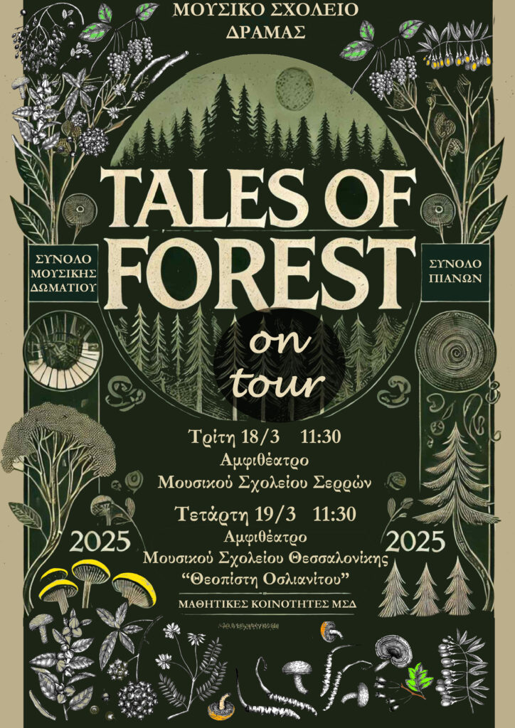 Το Μουσικό Σχολείο Δράμας παρουσίασε στο Αμφιθέατρο του σχολείου μας “Θεοπίστη Οσλιανίτου” μία πολυτροπική μουσική παρουσίαση Συνόλων Μουσικής Δωματίου και Πιάνων με τίτλο “Ιστορίες του Δάσους – Tales of Forest”. Η παράσταση με κεντρική έννοια το Δάσος, μέσα από διάφορες μορφές καλλιτεχνικής έκφρασης, αλλά και με πρωτότυπες μουσικές συνθέσεις, video art, λόγο και κίνηση, αντλεί έμπνευση τόσο από τη μυθολογία και την παγκόσμια παράδοση όσο και από τη σύγχρονη μουσική σκηνή. Προσεγγίζει το Δάσος μέσα από τις εκφάνσεις και τους συμβολισμούς του, συνομιλεί με την επικαιρότητα και εναποθέτει στους νέους την ελπίδα και τη θέληση για έναν κόσμο με περισσότερο σεβασμό και λιγότερη αλαζονεία. Οι εκπαιδευτικοί και οι μαθητές/τριες του Μουσικού Σχολείου Θεσσαλονίκης επιφύλαξαν στο τέλος ένα θερμό και από καρδιάς χειροκρότημα σε όλους τους συντελεστές της παράστασης.