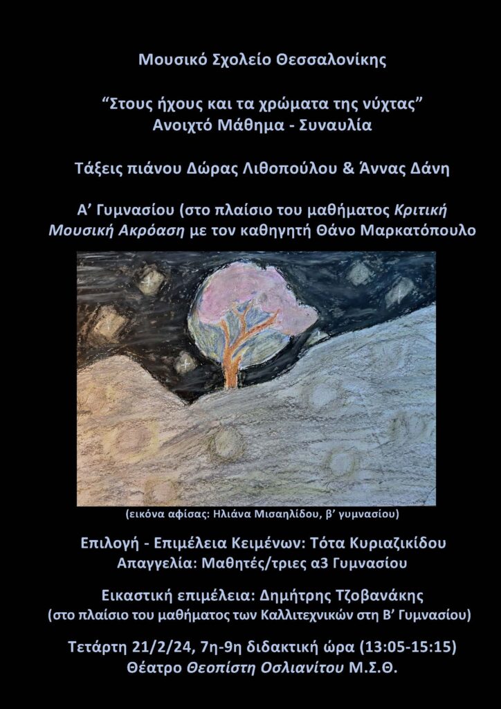 Την Τετάρτη 21 Φεβρουαρίου 2024, από την 7η έως την 9η διδακτική ώρα (13:05-15:15) θα πραγματοποιηθεί στο αμφιθέατρο Θεοπίστη Οσλιανίτου του Μουσικού Σχολείου Θεσσαλονίκης ανοιχτό μάθημα – συναυλία με τίτλο “Στους ήχους και τα χρώματα της νύχτας”.