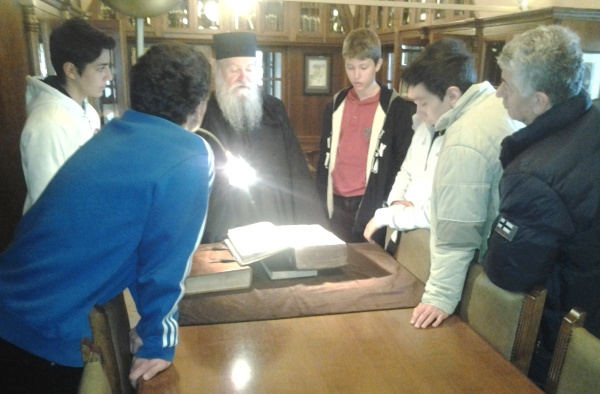 Οι μαθητές ξεναγήθηκαν στην Ιερά Μονή, εντυπωσιασμένοι μελέτησαν παλαιά χειρόγραφα της βιβλιοθήκης που αφορούν στην πολιτιστική μας αγιορείτικη μουσική κληρονομία από τον Υμνογράφο της Μ.Χ.Ε. π. Αθανάσιο. Συμμετείχαν ενεργά ψάλλοντας στις ακολουθίες της μονής. Την Κυριακή 16 Φεβρουαρίου, την ώρα της Θείας Λειτουργίας έψαλαν νέα μουσική σύνθεση «ΑΞΙΟΝ ΕΣΤΙ» του μαθητή Αγγέλου Παπαδόπουλου σε ήχο πρώτο.