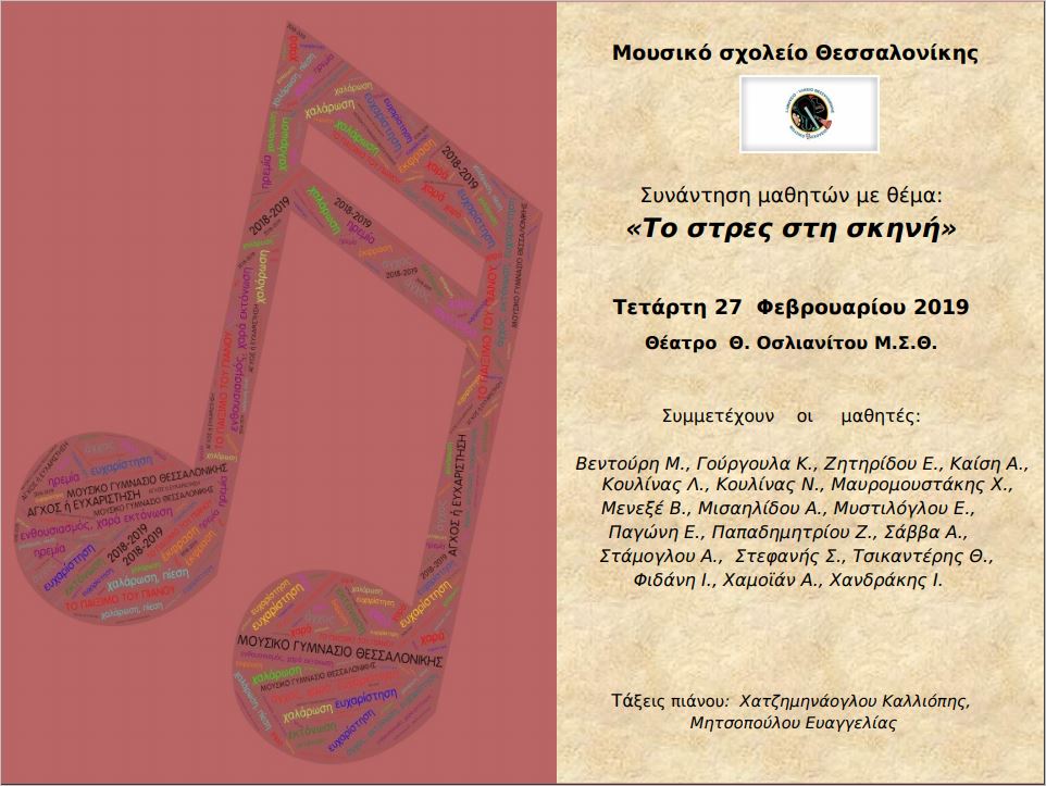 Αγαπητοί γονείς, Σας προσκαλούμε σε συνάντηση με θέμα «Το στρες στη σκηνή». Θα μιλήσουμε για το άγχος των παιδιών όταν καλούνται να συμμετέχουν σε συναυλίες, με στόχο να βοηθήσουμε τους μαθητές να χαίρονται τη μουσική ακόμη και όταν εκτίθενται στο κοινό για να παρουσιάσουν τη δουλειά τους δημόσια!
