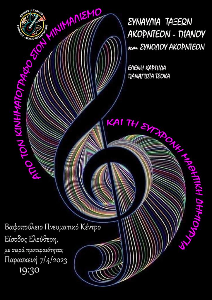 Έργα μουσικής από τον κινηματογράφο και τον μινιμαλισμό του 20ου και 21ου αιώνα, καθώς και πρωτότυπες μουσικές δημιουργίες μαθητών του Μουσικού Σχολείου Θεσσαλονίκης θα ακουστούν την Παρασκευή, 7 Απριλίου, 2023, στις 19:30.